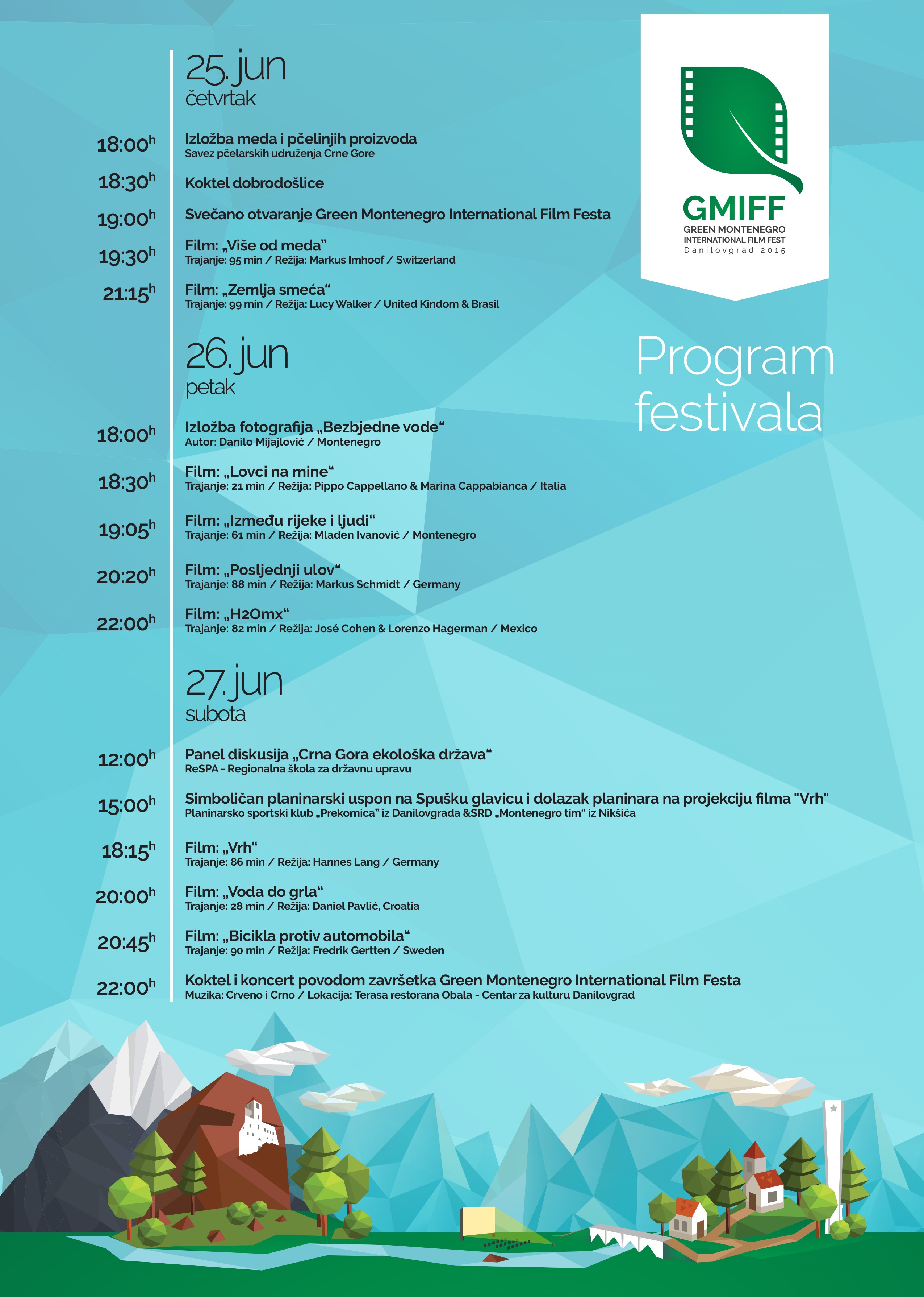 Na Festivalu će biti prikazano devet filmova crnogorske, regionalne i svjetske produkcije, koji obuhvataju aktuelne teme, kao što su ekologija, zaštita životne sredine i održivi razvoj.